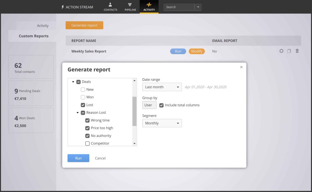 It gives you an overview of your whole business and presents your KPIs in a visual format. And instead of bombarding you with as many insights as possible, it focuses on data about essentials like contacts, deals, activities, and overall sales performance.